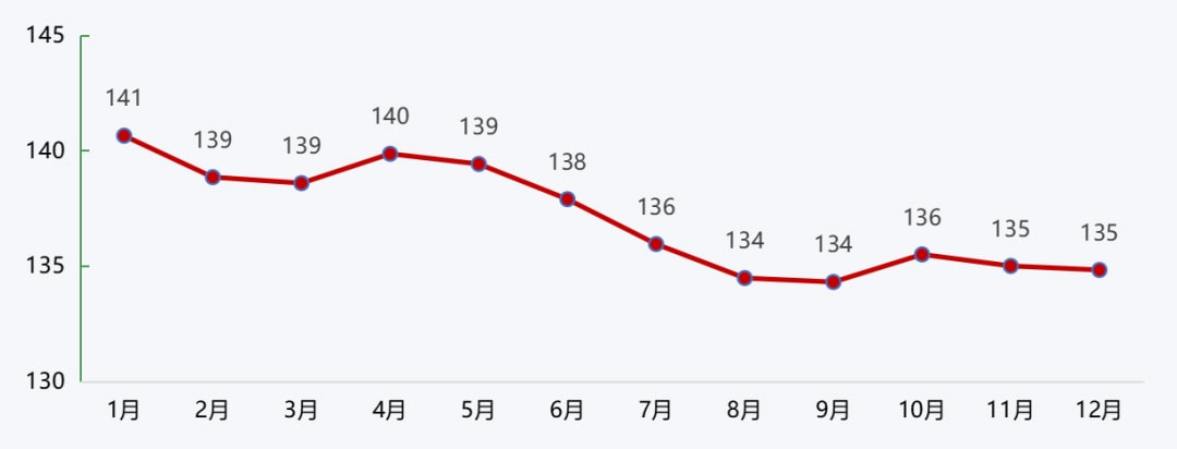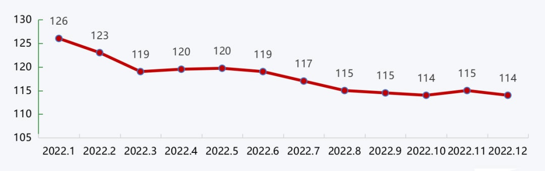 沿江城市砂石价格在年初高位运行的基础上,受到疫情封港、下游需求不佳、沿江运费高企等因素的影响,价格持续回落,进入四季度,随着施工旺季的到来,需求回升,价格也随着略有回升。整体来看,2022年沿江港口砂石价格持续回落,12月降至114元/吨,较年初下降3.4%。