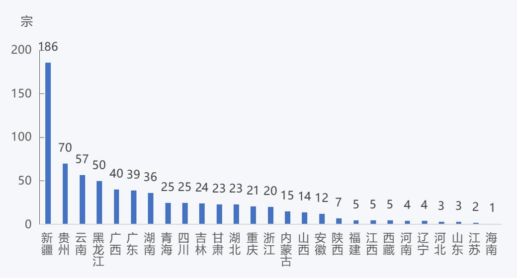 2022年,全国新设砂石矿权数量719宗,其中新疆新设砂石矿权数量最多,为186宗;贵州、云南、黑龙江新设砂石矿权数量为50~70宗;广西、广东、湖南新设砂石矿权数量为35~40宗;青海、四川、吉林、甘肃、湖北、重庆、浙江、内蒙古、山西、安徽新设砂石矿权数量为10~25宗;陕西、福建、江西、西藏、河南、辽宁、河北、山东、江苏、海南新设砂石矿权数量在10宗以内。