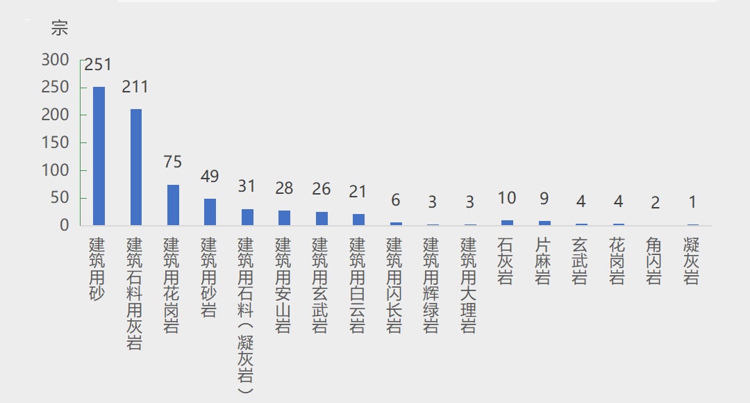 全国新设砂石矿权中,有建筑用砂、建筑石料用灰岩、建筑用花岗岩、建筑用砂岩、建筑用石料(凝灰岩)、建筑用安山岩、建筑用玄武岩、建筑用白云岩、石灰岩、片麻岩、建筑用闪长岩、玄武岩、花岗岩、建筑用辉绿岩、建筑用大理岩、角闪岩、凝灰岩17种矿种。其中建筑用砂、建筑石料用灰岩两类矿种新设数量最多,分别为251宗、211宗;建筑用花岗岩矿75宗;建筑用砂岩、建筑用石料(凝灰岩)、建筑用安山岩、建筑用玄武岩、建筑用白云岩五类矿种新设数量在20~50宗;建筑用闪长岩、建筑用辉绿岩、建筑用大理岩三类矿种新设数量在10宗以内;另外,新设10宗石灰岩矿、9宗片麻岩矿、4宗玄武岩矿、4宗花岗岩矿、2宗角闪岩矿、1宗凝灰岩矿。