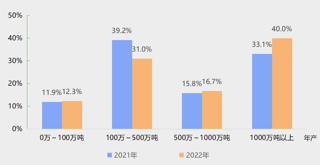 新设砂石矿权中,资源储量大于1000万吨的超大型砂石矿权、资源储量在500万~1000万吨之间的大型砂石矿权,占比分别提升至40.0%、16.7%,占比均较2021年有所提升。另外,资源储量在100万~500万吨之间的中型砂石矿权占比为31.0%;资源储量在100万吨以下的小型砂石矿权占比为12.3%,中型、小型砂石矿权占比均较2021年有所下降。
