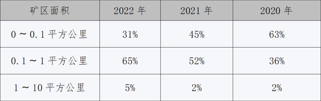 从新设砂石矿权矿区面积来看,砂石行业规模化水平进一步提升,矿区面积0.1~1平方公里之间砂石矿权占新设砂石矿权六成以上,成为新设矿权的主流。新设砂石矿权中,矿区面积在0~0.1平方公里之间的有222宗,占比为31%,占比较2021年下降14个百分点,新设小规模砂石矿权数量持续减少;矿区面积在0.1~1平方公里之间的新设砂石矿权有464宗,占比逐年提升,2022年已经达到65%;矿区面积在1~10平方公里之间的新设砂石矿权33宗,占比为5%。