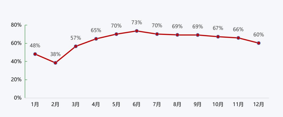 2022年砂石企业开机率和产能利用率走势较为一致,均在年初、年尾出现回落,年中保持较高水平。一季度,受春节假期、雨雪天气等影响,开机率、产能利用率均较低,2月更是分别降至38%、19%;二季度疫情逐渐缓解,三季度工程旺季到来,二、三季度开机率、产能利用率均保持较高水平,6月更是达到了年度最高水平,分别升至73%、39%;进入四季度,受到雨雪天气到来以及疫情的反复,双重因素的影响导致开机率、产能利用率均出现回落,12月,分别降至60%、35%。