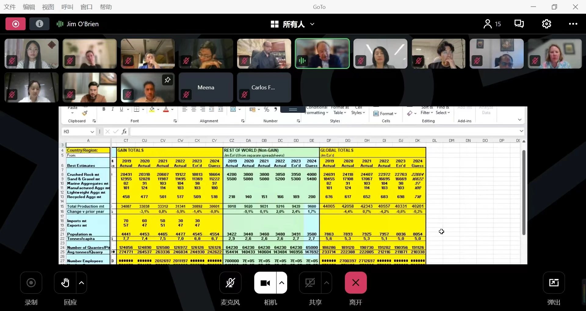 全球砂石骨料信息网络组织创始人吉姆(Jim)先生感谢各国各地区协会和社团组织提交的2023年砂石产量数据。他强调了产量数据对掌握行业发展现状和预测未来发展趋势的重要性,并对各区域数据情况作出总结,各国各地区砂石协会和组织进行了补充说明。